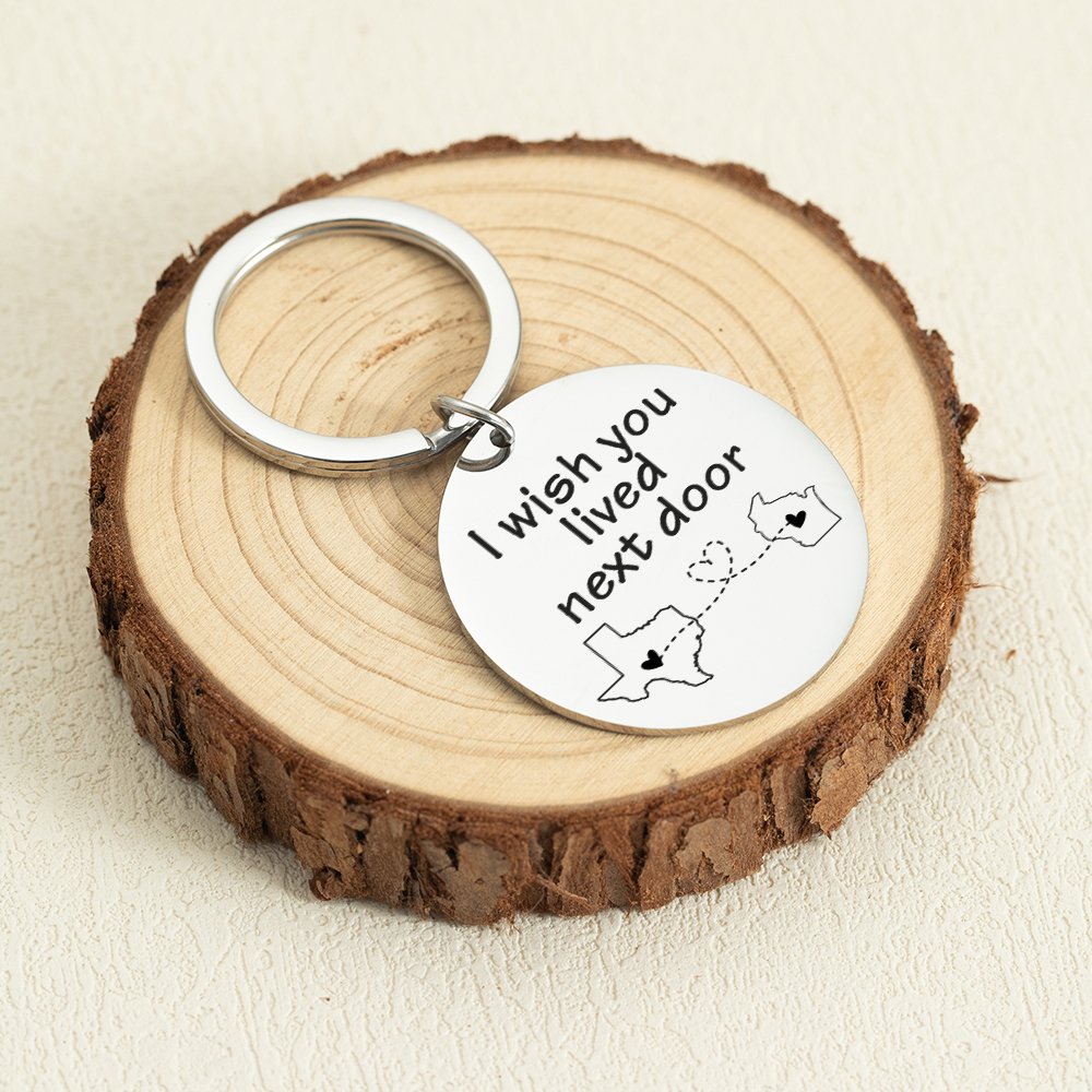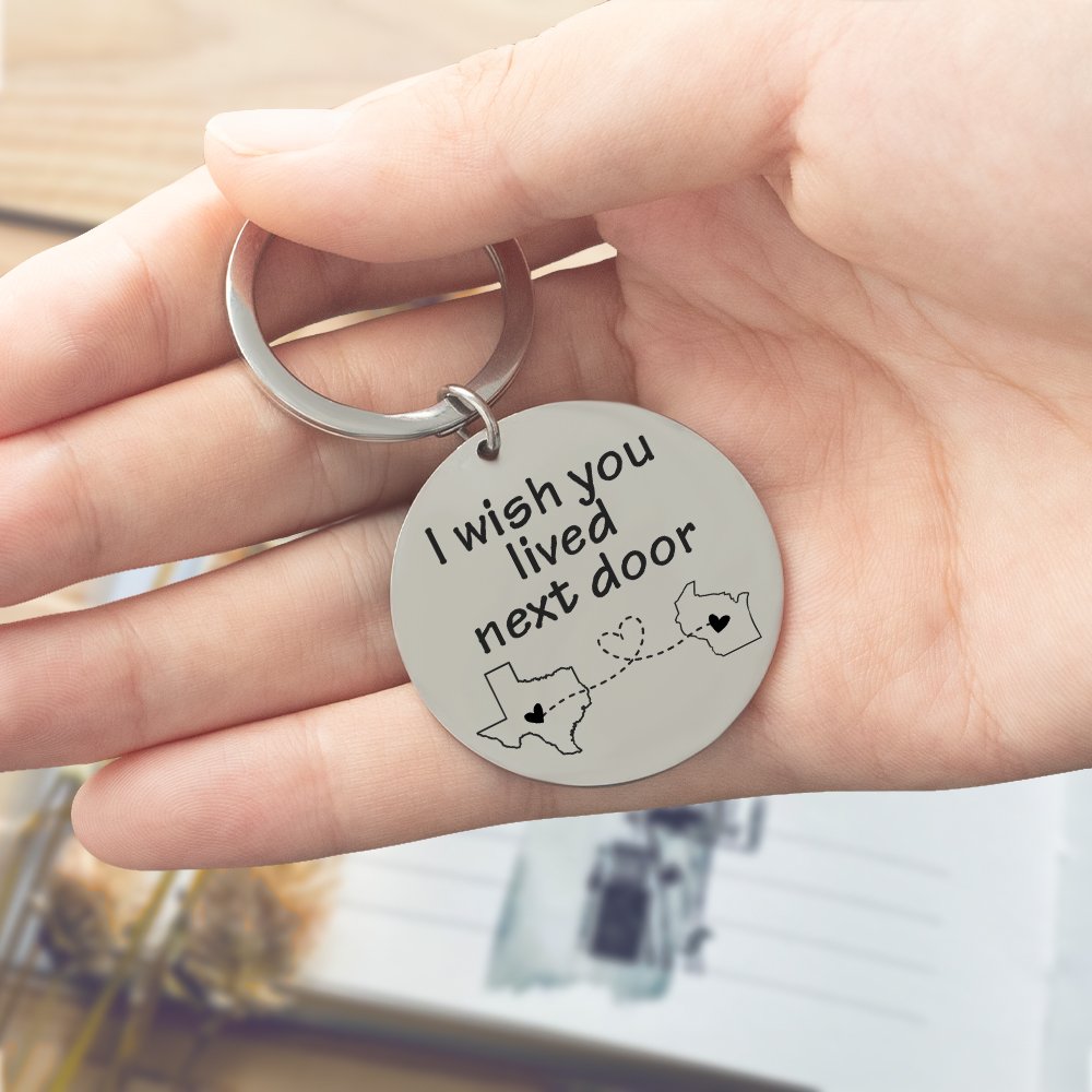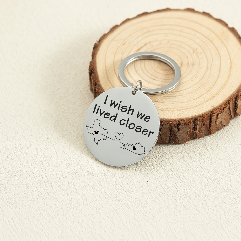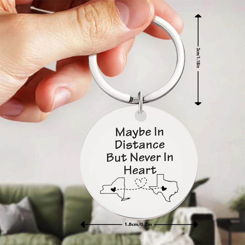 Introducing this stunning stainless steel keychain! Choose from four fixed phrases that express the wish to live closer to each other. The map below is connected by a dotted line, forming two heart-shaped symbols, symbolizing the connection between each other's hearts. You can customize it to your and the recipient's states to create a one-of-a-kind keychain.
