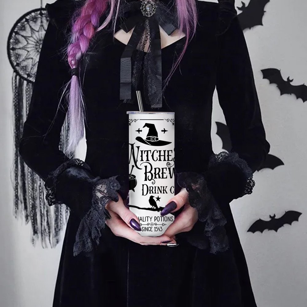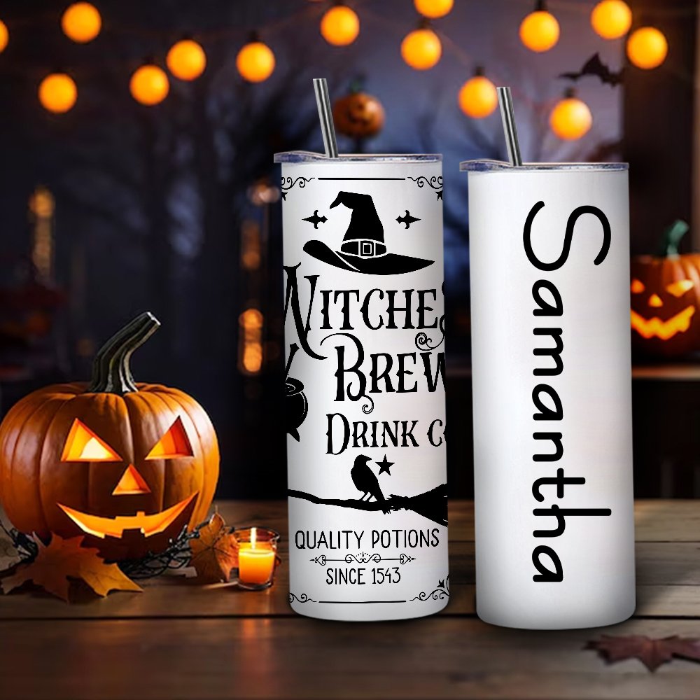This tumbler's design is full of mystery and magic, perfect for the fall and Halloween themes. The carefully printed "Witches Brew Drink Co." on the tumbler makes the tumbler more interesting and attractive. Elements such as a wizard's hat, a crow, and a magic broom on the tumbler perfectly blend the symbols of a traditional wizard or witch to create an ancient potions brewing atmosphere. You can also customize the name on the tumbler to make it even more special.