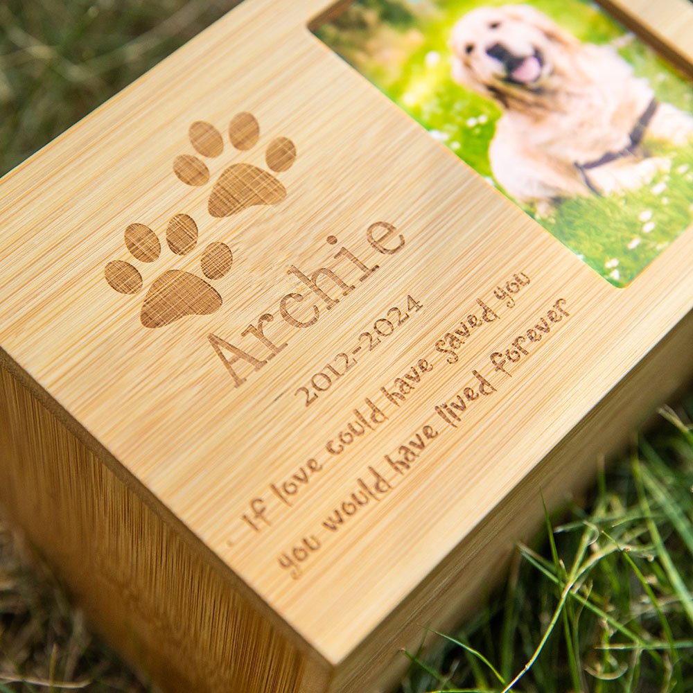 This pet urn allows you to Personalise it with a photo and engraved text, creating a truly special and meaningful tribute to your cherished pet. The photo window provides a place to display a favorite picture of your pet, capturing their unique personality and capturing the memories you shared together. The engraved text allows you to add your pet's name, dates, or a heartfelt message, creating a memorial that honors their life and the love you shared.