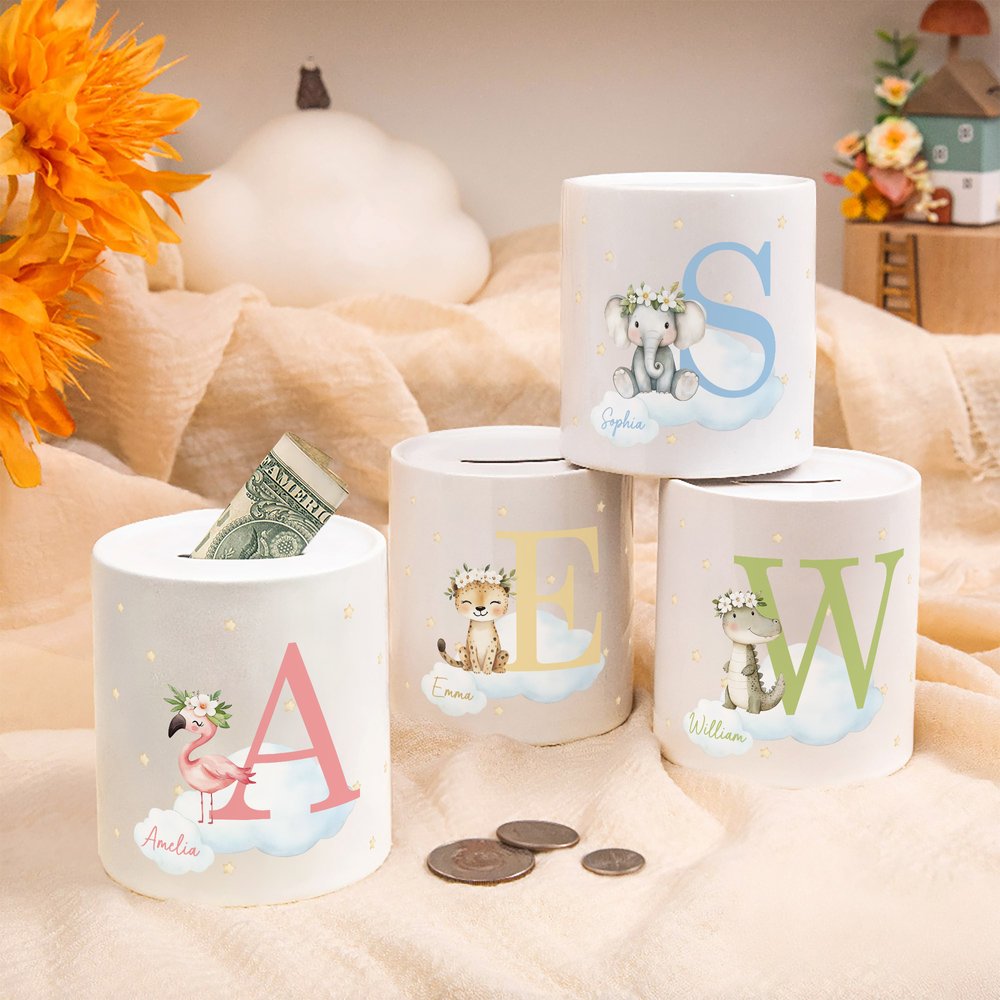 This ceramic piggy bank cleverly combines adorable animal and floral elements, and can be Personalised with a child’s name, creating a fun savings companion that belongs uniquely to them. The lively and playful design on the body, along with a hidden round hole at the bottom fitted with a rubber stopper, allows for easy, tool-free opening and closing—safe, secure, and convenient.