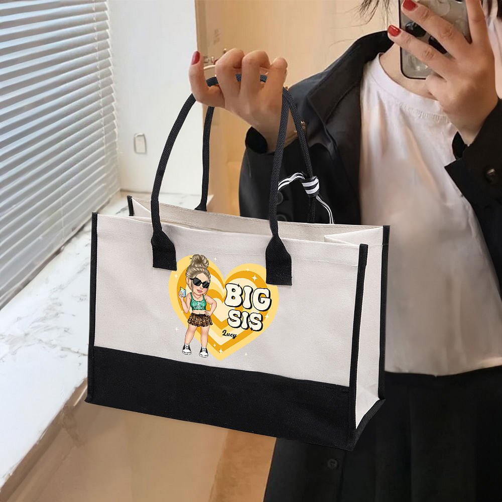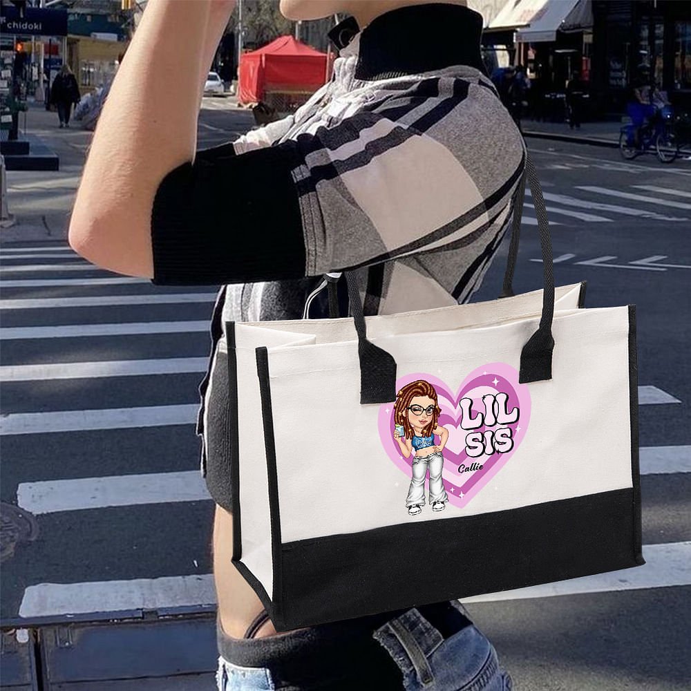 Our tote bag uses a simple and stylish black and white color scheme, plus a custom Y2K style pattern, full of trendy feeling. You can freely customize the Y2K girl image according to your own or the other person's natural appearance and choose titles such as "Big Sis" and "Lil Sis" as well as custom names to express the close friendship between sisters.
