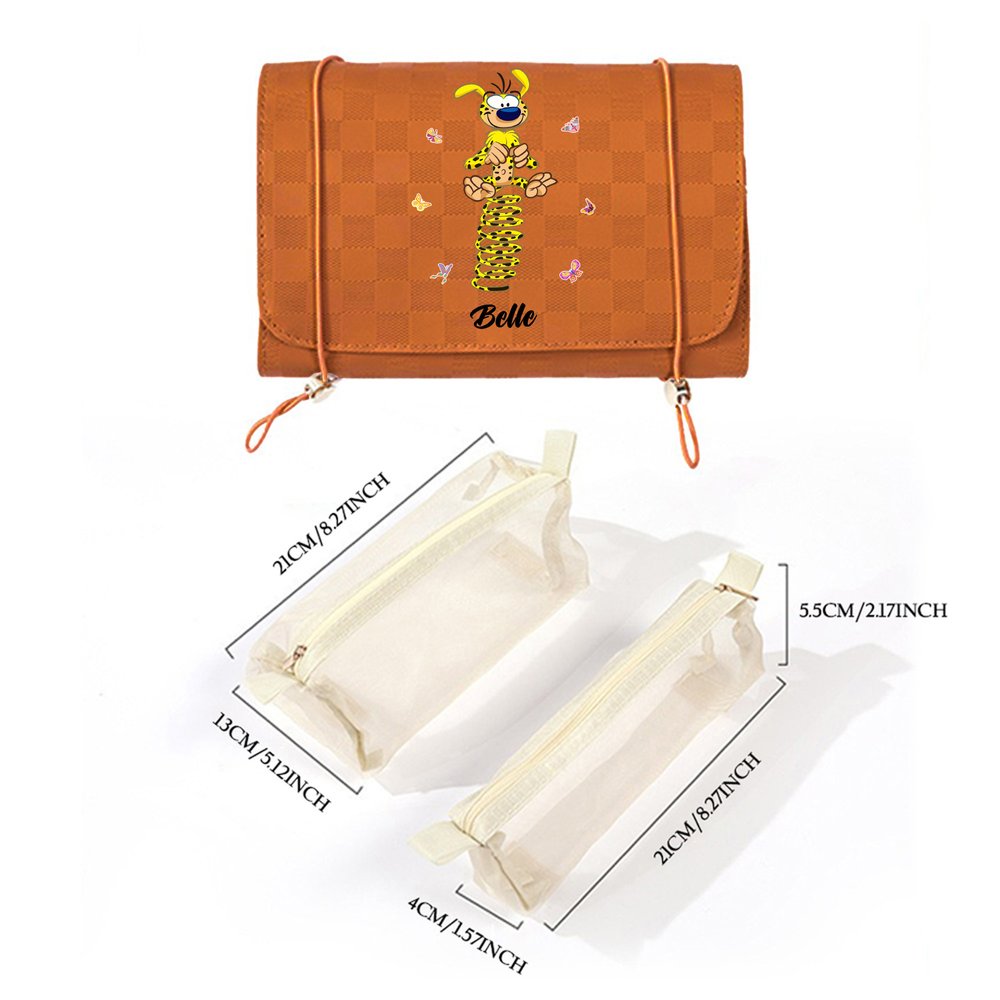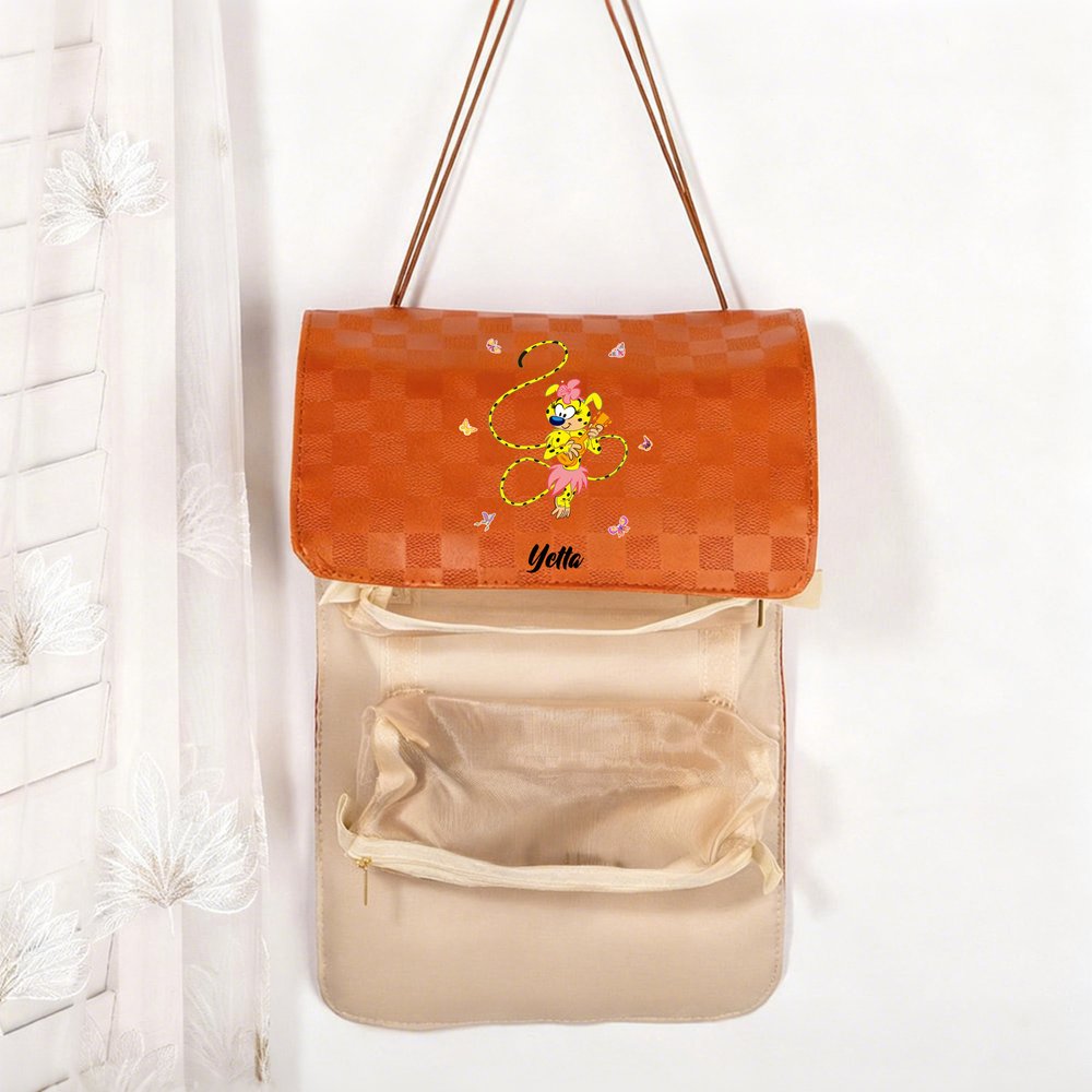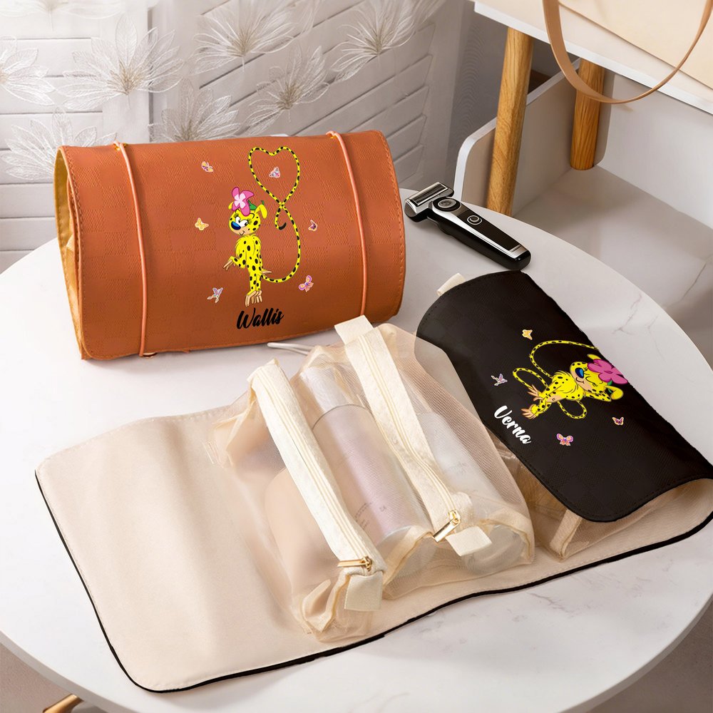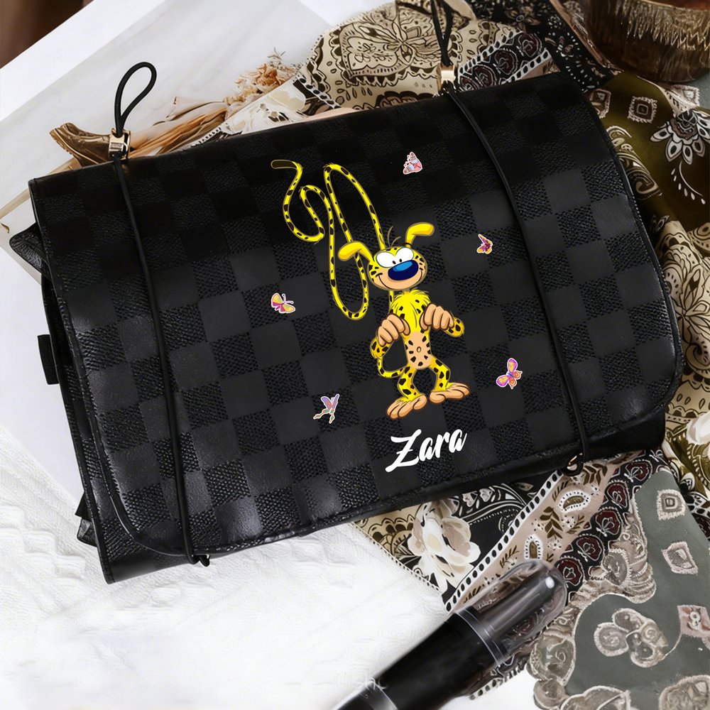 You can choose the cute cartoon image pattern of Tail-Bouncing Marsupilami, which was created by Belgian cartoonist André Franquin in 1952. Marsupilami is a jungle-dwelling creature with yellow fur, black spots, and a super flexible, long tail. This makeup bag can be customized with a name, making it a Personalised everyday item.