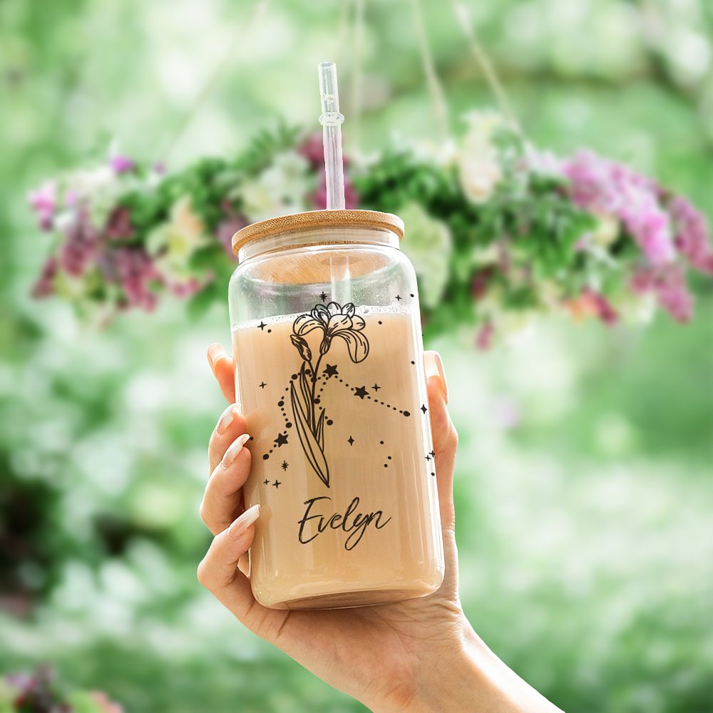 Each person's birth month has its unique birthday flower, each with its special meaning. Our glass tumblers are inspired by this and incorporate a uniquely captivating constellation design, with simple black lines outlining the constellation and floral styles, intertwined to mesmerize and create a captivating visual experience.