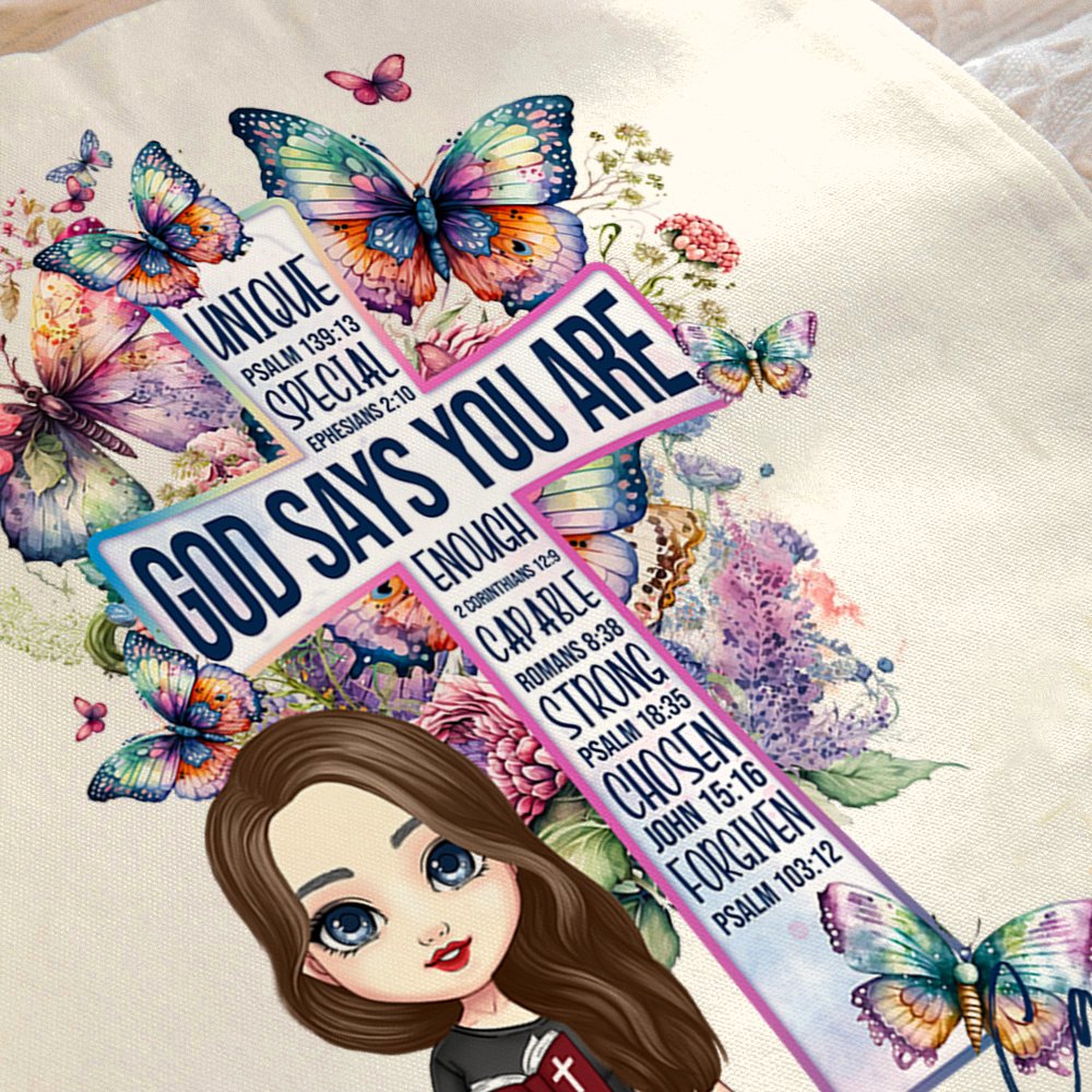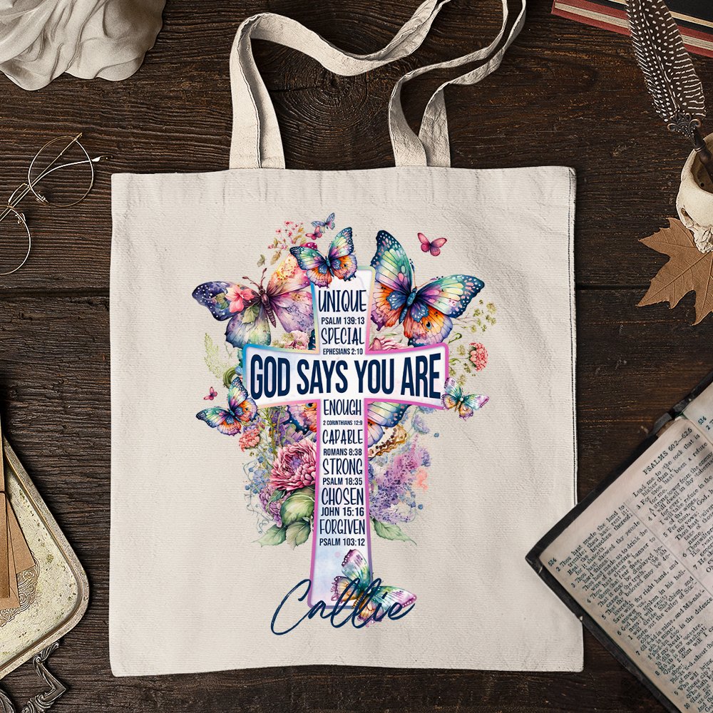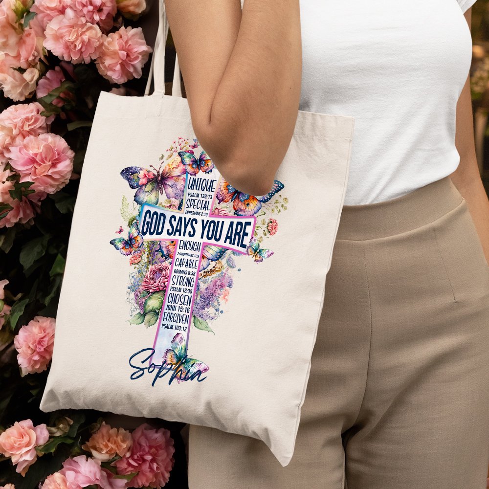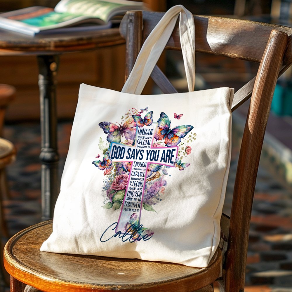 This "God Says You Are" canvas bag uniquely combines a Bible verse cross, watercolour butterflies, and birth flowers. It can be Personalised with names, giving it a personal feel and turning it into a meaningful keepsake that reflects the wearer's essence of faith and family connection.